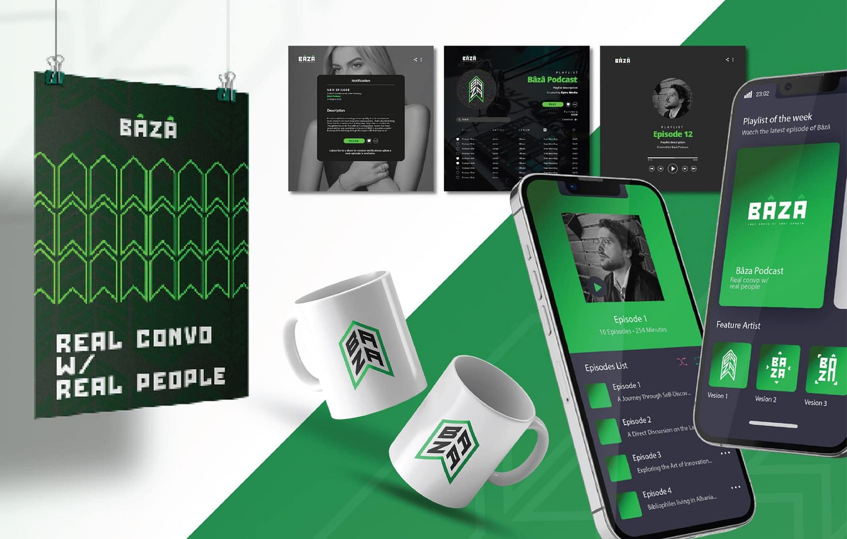 Concept Marketing designed the brand identity for the newest voice in the podcast scene. BÂZÂ , in the Gheg Albanian dialect, means ‘me ba za’ - give voice. BÂZÂ offers a base for people to come together and talk over actual & conceptual matters. The brand name features the letters ‘B A Z A’ and is coupled with arrows that indicate out-of-the-box and controversial thinking. Arrows in the position of A’s circumflex bring a feeling of the Albanian Gheg dialect.