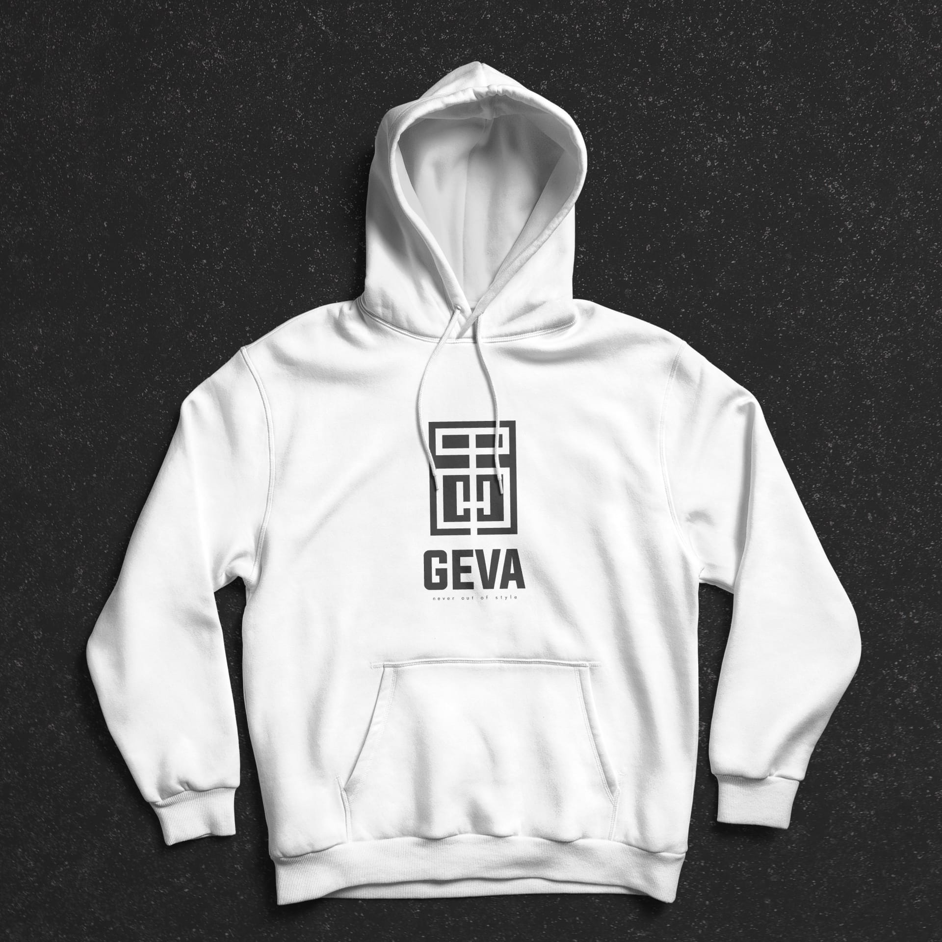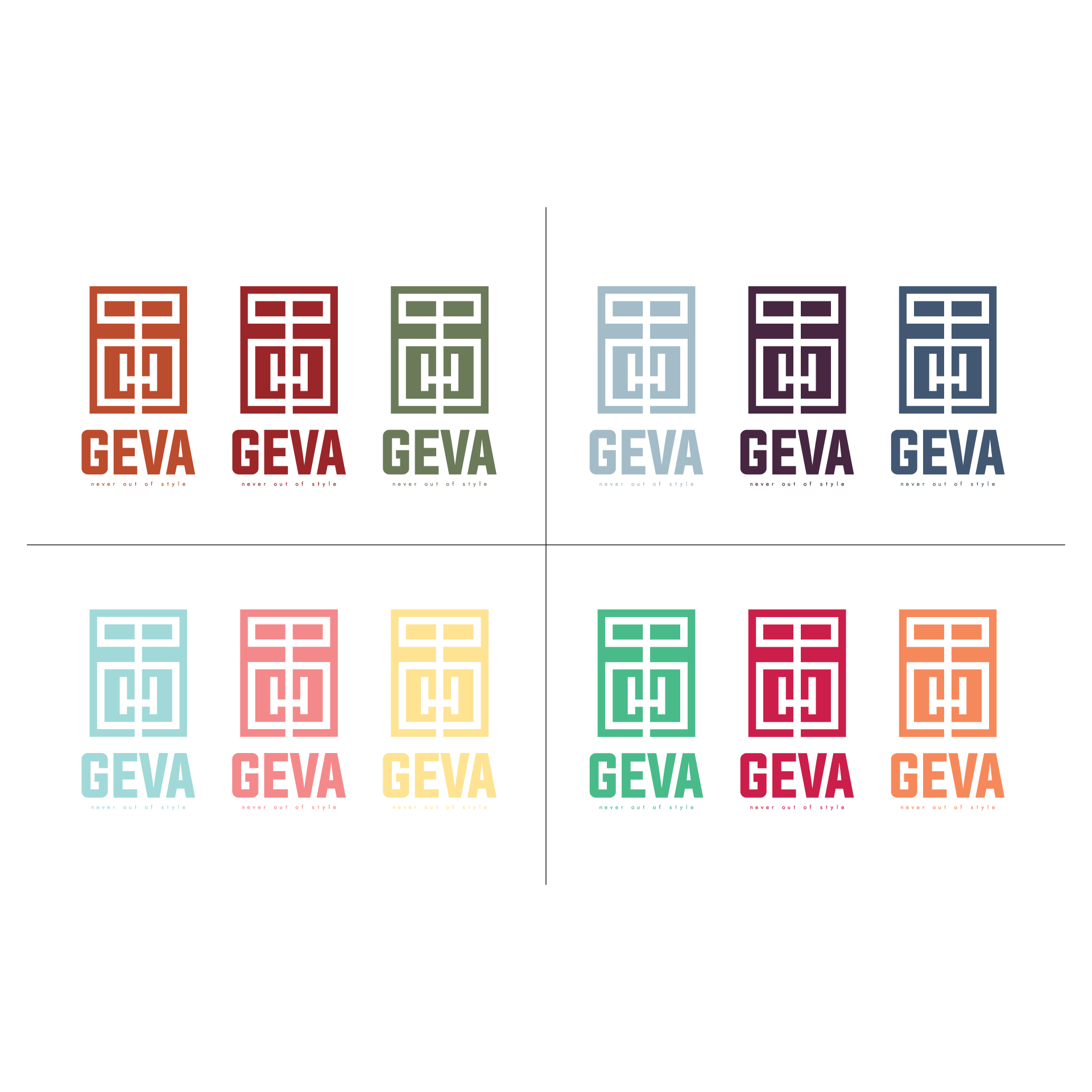 The final version is made of the brand's name GEVA, after getting the letters close to each other, rotating, and then mirroring them.