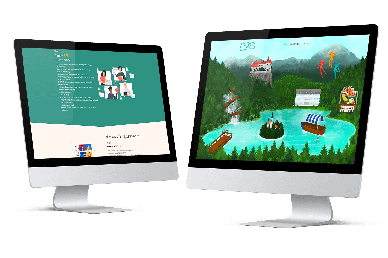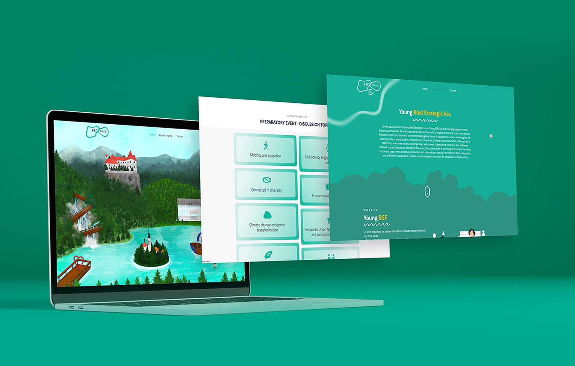 From the history of the city where the forum is held, Bled in Slovenia, we were inspired to build personalized graphics, where the country lake, the architecture of the buildings, the tradition, and the magic that the natural landscape offers are in harmony.